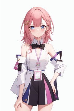 <lora:艾丝妲v2:1:lbw=char>,asta,1girl,pink hair,braid,hair ornament,white shirt,bare shoulders,long hair,detached sleeves,sleeveless shirt,black skirt,id card,bowtie,, (masterpiece,best quality:1.2),absurdres, high quality,