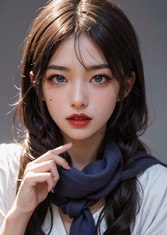 1girl, blue eyes, black hair, realistic, scarf, looking at viewer, twintails, solo, lips, long hair, portrait, nose, closed mouth, solo focus, finger to mouth, simple background, traditional media, pov, purple scarf, close-up, mole, blue background, bangs, signature, upper body, parted lips, out of frame, red lips, hair between eyes, pov hands, open mouth, blush, makeup, brown hair, grey background, eye focus, lipstick, realistic details, surrealistic, sense of reality, intense contrast of light and shadow