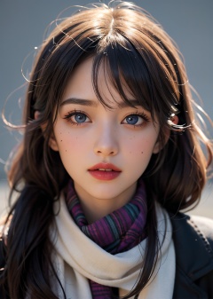 1girl, blue eyes, black hair, realistic, scarf, looking at viewer, twintails, solo, lips, long hair, portrait, nose, closed mouth, solo focus, finger to mouth, simple background, traditional media, pov, purple scarf, close-up, mole, blue background, bangs, signature, upper body, parted lips, out of frame, red lips, hair between eyes, pov hands, open mouth, blush, makeup, brown hair, grey background, eye focus, lipstick, realistic details, surrealistic, sense of reality, intense contrast of light and shadow