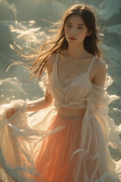 sdmai,xianyufeng, 1girl, solo, jewelry, realistic, long hair, earrings, necklace, looking at viewer, brown hair, parted lips, see-through, tiara, bare shoulders