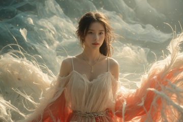 sdmai,xianyufeng, 1girl, solo, jewelry, realistic, long hair, earrings, necklace, looking at viewer, brown hair, parted lips, see-through, tiara, bare shoulders