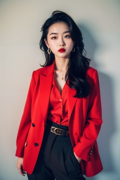 1girl,solo,jewelry,earrings,black hair,formal,suit,red lips,lipstick,pants,red shirt,jacket,long hair,makeup,shadow,looking at viewer,hands in pockets,belt,shirt,
