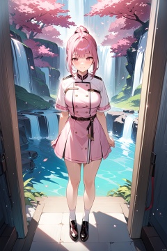 Masterpiece, best quality, official art, extremely detailed CG uniform 8k wallpaper, 1girl, high ponytail, looking at viewer, perspective, standing, smile, full body, waterfall, pink dress, light, light particles,