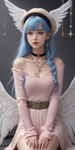 1girl, solo, long hair, looking at viewer, blush, bangs, blue eyes, hair ornament, long sleeves, hair between eyes, jewelry, sitting, very long hair, closed mouth, blue hair, earrings, wings, choker, virtual youtuber, necklace, star \(symbol\), sweater, sleeves past wrists, black choker, halo, cross, feathered wings, puffy long sleeves, angel wings, star hair ornament, white wings, angel, star earrings, cross necklace, latin cross, star necklace,pink hair, hat