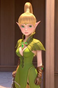 1girl,blonde hair,pointy ears,green eyes,gloves,solo,brown gloves,hand on hip,elf,breasts,looking at viewer,long hair,ponytail,dress,bangs,green dress,lips,closed mouth,gem,blunt bangs,blurry,cleavage,medium breasts,<lora:liya-000004:0.7>,crossed_arms,