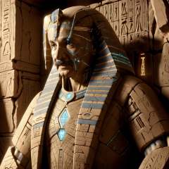 <lora:EgyptTech-30:0.8> egypttech ,scifi, hieroglyphs, sandstone,man , Albert Einstein, <lora:Albert Einstein:0.8> , scientist coat, at a lab