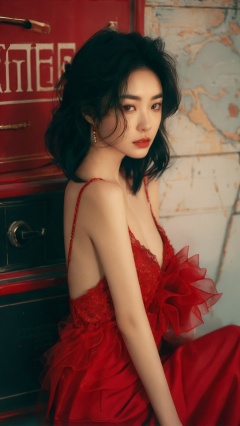 sdmai,hongchen,1girl,solo,red dress,dress,black hair,realistic,looking at viewer,breasts,<lora:SDMAI红尘hongchen:0.7>,