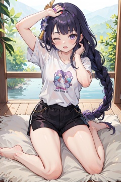 1girl, raiden shogun, solo, dolphin shorts, shirt, shorts, one eye closed,  short shorts, barefoot, short sleeves,ed ponytail, black shorts, white shirt, arm up, looking at viewer, sitting, bare legs, blush, mole, yokozuwari, mole under eye, thighs,  hand on own head, sidelocks, nail polish