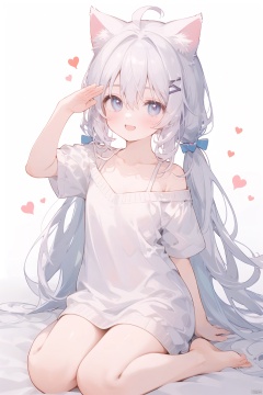 30710, petite, loli, solo, animal ears, heart, puffy short sleeves, white hair, long hair, off shoulder, bangs, hair ornament, gradient background,rainbow gradient, x hair ornament, animal ear fluff, looking at viewer, very long hair, blush, smile, cat ears, bare shoulders, collarbone, hand up, gradient sweater, hair between eyes, symbol-shaped pupils, arm up, heart-shaped pupils, hairclip, medium breasts, salute, bare legs,full body