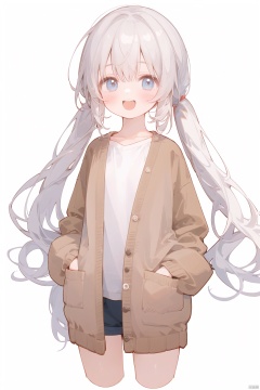 1girl, solo,light brown hair, twintails, blush, smile, shirt, white shirt, long shirt, ^ ^, brown cardigan, cardigan, closed eyes, collarbone, cropped legs, long sleeves, sleeves past fingers, sleeves past wrists, upper teeth only, teeth, white background