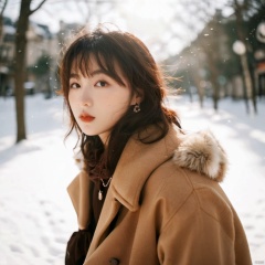 any_girl face focus, 8k UHD, (film still, epic film, HDR, RAW photo, best quality), (realistic, photo-realistic:1.3), sharp focus, best shadow, Professional portrait photography, (extremely delicate and beautiful:1.1), ( film grain:1.4), (exquisitely detailed skin:1.3), Extreme Detail, professional grading, film pellet, youth, 1girl, looking at viewer, full body, jewelry, necklace, realistic, brown hair, blurry background, blurry, bangs, black eyes, paris, fashion, peoples in background, winter coat, dynamic pose, motion blur, Warm sun:1.7, Winter, snow, Ultra-Wide Angle, Wide Angle, Fisheye Lens Effect,Angle Fisheye