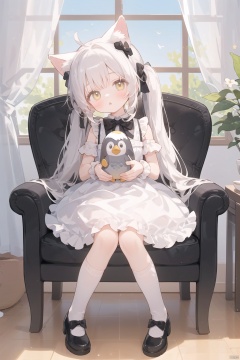 (masterpiece), (best quality),artist WERI, loli,1girl, dress, long hair, cup, curtains, sitting, solo, yellow eyes, looking at viewer, very long hair, black dress, star (symbol), teacup, chair, table, bow, bird, animal ears, window, black footwear, twintails, socks, ribbon, wrist cuffs, shoes, head tilt, hair ribbon, stuffed toy, sleeveless dress, teapot, rabbit ears, bangs, stuffed penguin, holding, knees together feet apart, blush, sleeveless, hairband, penguin, saucer, full body, lolita fashion, owl, white socks, stuffed animal, :o, frills, black bow, frilled dress, indoors