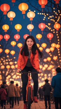 lantern,blurry,night,paper lantern,ground vehicle,1girl,long hair,kind_smile,tree,depth of field,bag,solo focus,bicycle,walking,sky,black hair,blurry background,jacket,road,happy_new_year,front view,