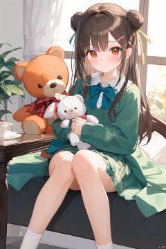 1girl, stuffed animal, stuffed toy, solo, dress, long hair, sitting, looking at viewer, teddy bear, holding stuffed toy, long sleeves, hair ornament, hair bun, bow, green dress, orange bow, plaid, blush, socks, frills, bangs, closed mouth, holding, red eyes, orange bowtie, flower, feet out of frame, ribbon, hair ribbon, single side bun, green bow, brown hair, table, blanket, black ribbon, hairclip, collar, bowtie