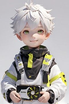 ZOTAC, solo, looking at viewer, blush, smile, 1boy, holding,Graphics card,  upper body, male focus, necklace, ZOTAC