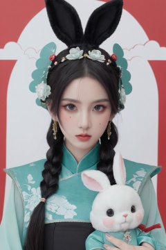 Illustration, digital art, anime style, hubggirl, red eyes, black hair, hair bun with accessories, traditional East Asian attire, rabbit ears headpiece, black and teal clothing, cloud pattern on garment, mystical, two black rabbits, one on shoulder and one in foreground, pale skin, blush on cheeks, serious expression, white background, portrait, upper body shot, artful composition, detailed line art, vibrant color contrast., HUBG_Beauty_Girl