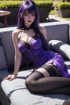 1girl, boobs, full_ body, long hair, thighhighs, jewelry, solo, dress, blue dress, cleavage, Stretch one's legs, purple eyes, bracelet, Lie down on the couch, bare shoulders, purple hair, sleeveless dress, bangs, Sunny garden, breasts, very long hair, sleeveless, black thighhighs, black hair, closed mouth, lace-trimmed legwear, gem, red lips, lace-trimmed dress, lace Leg posture, shengcaier, tentacle-pit, Deep view, full body,<lora:EMS-244923-EMS:0.800000>,<lora:EMS-80191-EMS:0.600000>