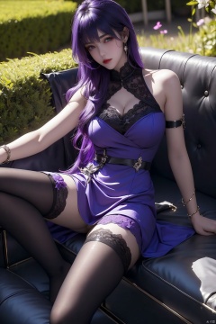 1girl, boobs, full_ body, long hair, thighhighs, jewelry, solo, dress, blue dress, cleavage, Stretch one's legs, purple eyes, bracelet, Lie down on the couch, bare shoulders, purple hair, sleeveless dress, bangs, Sunny garden, breasts, very long hair, sleeveless, black thighhighs, black hair, closed mouth, lace-trimmed legwear, gem, red lips, lace-trimmed dress, lace Leg posture, shengcaier, tentacle-pit, Deep view, full body,<lora:EMS-244923-EMS:0.800000>,<lora:EMS-80191-EMS:0.600000>