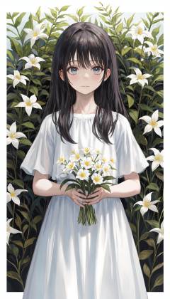 1girl, solo, looking at viewer, long hair, closed mouth, simple background,flower,white dress,cowboy shot,border