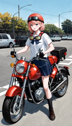 1girl, goggles around neck, solo, ground vehicle, outdoors, goggles, skirt, motorcycle, motor vehicle, pleated skirt, helmet, school uniform, shirt, white shirt, short sleeves, boots, socks