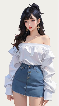 (best quality), ((masterpiece)), (highres), illustration, original, extremely detailed,<lora:韩の时尚衣橱:0.7>1girl, solo, skirt, black hair, long hair, jewelry, shirt, earrings, off shoulder, looking at viewer, white shirt, simple background, sleeves past wrists, off-shoulder shirt, parted lips, denim, blue skirt, long sleeves, white background, lips, bare shoulders, one side up, standing, red lips, black eyes