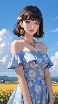 (best quality), ((masterpiece)), (highres), illustration, original, extremely detailed,<lora:韩の时尚衣橱:0.7>1girl, solo, black hair, dress, jewelry, sky, day, brown eyes, looking at viewer, lips, blue sky, earrings, bangs, cloud, hair ornament, parted lips, necklace, bare shoulders, outdoors, floral print, blunt bangs