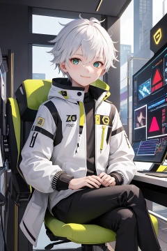 ZOTAC, solo, looking at viewer,shota, hair between eyes, closed mouth,green_eyes,jacket,male focus, white jacket,science fiction, Arso, machinery,sitting_down,smile, Cyberpunk Concept, robot