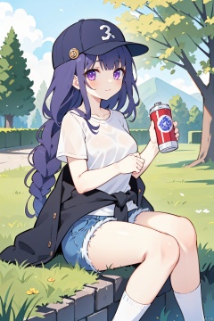 1girl, solo, baseball cap, can, hat, looking at viewer, holding, shorts, raiden shogun, shirt, outdoors, holding can, sitting, blurry, white shirt, blurry background, short sleeves, tree, white socks, knee up, closed mouth, clothes around waist, socks, soda can, from side, blue headwear, jacket