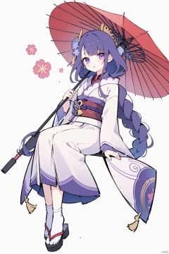 1girl, umbrella, raiden shogun, kimono, solo, japanese clothes, flower, hair ornament, full body, holding umbrella, oil-paper umbrella, holding, looking at viewer, white background, mole under eye, obi, sash, mole, tabi
