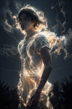 glowing_crystal dress,glowing,lightning,glowing_hair,storm,fog,cloud,male focus,1boy,<lora:Dianhuun218 (11):0.7>,