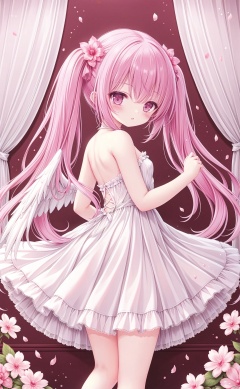 masterpiece,best quality,very long hair,cowboy shot,moinszero,moinszero,moinszero,moinszero,moinszero,moinszero,moinszero,moinszero,moinszero,moinszero,moinszero,moinszero,moinszero,moinszero,moinszero,moinszero,1girl,solo,dress,wings,twintails,white_dress,looking_at_viewer,pink_hair,long_hair,feathered_wings,pink_flower,pink_eyes,flower,bangs,backless_dress,backless_outfit,bare_shoulders,looking_back,hair_between_eyes,white_wings,angel_wings,blush,strapless,curtains,