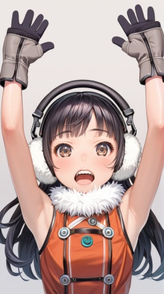 (best quality), ((masterpiece)), (highres), illustration, original, extremely detailed,  <lora:莲实复古动漫XL:0.7>1girl, solo, earmuffs, gloves, arms up, long hair, armpits, black hair, open mouth, looking at viewer, bangs, sleeveless, teeth, upper body, fur trim, brown eyes, simple background, blush, grey gloves