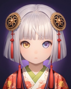 (best quality), ((masterpiece)), (highres), illustration, original, extremely detailed,  <lora:莲实复古动漫XL:0.7>1girl, solo, short hair, hair ornament, looking at viewer, bangs, heterochromia, white hair, japanese clothes, child, kimono, blue eyes, tassel, female child, upper body, purple background, closed mouth, simple background, bob cut, blunt bangs, expressionless, purple eyes