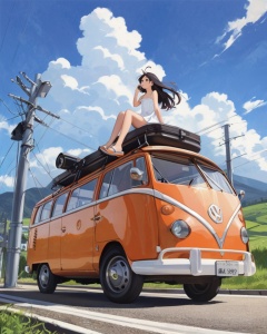 (best quality), ((masterpiece)), (highres), illustration, original, extremely detailed,  <lora:莲实复古动漫XL:0.7>1girl, sandals, flip-flops, ground vehicle, sitting, white dress, dress, motor vehicle, looking up, solo, sleeveless dress, outdoors, utility pole, power lines, holding, on vehicle, sky, cloud, floating hair, car, sleeveless, wind, black hair, from below, arm support, bare arms, product placement, road, cloudy sky, day, long hair, mountainous horizon, ahoge, artist name, looking afar, sundress, shoe soles, bare legs, shoe dangle, wide shot, from side, holding camera, arm at side, bare shoulders, hand up, english text, vehicle focus, looking away, parted lips, camera, shadow, flat chest, hill, signature, black eyes, blue sky, grass