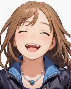 (best quality), ((masterpiece)), (highres), illustration, original, extremely detailed,  <lora:莲实复古动漫XL:0.7>1girl, solo, jewelry, smile, open mouth, necklace, long hair, closed eyes, brown hair, jacket, :d, simple background, teeth, white background, blush