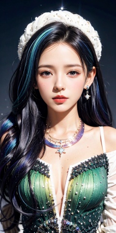 1 girl, Aurora, Blue Eyes, (Colorful Gradient Hair: 1.5), Dynamic Pose, Constellation, Constellation Print, Diffraction Spikes, Dress, Crystal Girl, Crystal, Colorful Crystal, Crystal Headwear, Crystal Necklace, Earrings, Fireworks, Galaxy, Blinking, Hat, Jewelry, Light Particles, Light, Light Traces, Long Hair, Energy Circle, Magic Formation, Concentric Circle, Long Sleeve, Magic, Magic Circle, Sparkling, Sparkling Background, Starry sky, super long hair, zhangyuxi, ((poakl))