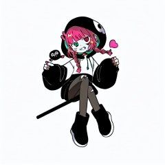 gurin(\style) ,1 girl ,solo big round eyes, solo, full body, sitting on a sickle, skull cap covering her head, hoodie, double braids, flat bangs, holding the sickle in her hand, pink hair, black footwear, black hoodie, grin, green and red eyes, sitting, heterochromia, looking at viewer, ripped black pants, grim reaper, long sleeves, nail polish, heart, red Nails, exposed teeth, blush stickers, sleeves over wrists, white and clean background <lora:gurin V2-25-000026:0.8>