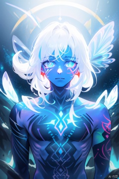 (extreamly delicate and beautiful:1.2), 8K, (tmasterpiece, best:1.2), (MALE:1.5) masterpiece, best quality, (detailed:1.3) halfnaked body with pale skin and (long_white_hair:1.4). All of his pale skin there are (blue_glowing_tattoes:1.5), on face, on body. (MAGICAL_BIOLUMINESCENT_TATTOOES:1.5) Naked upper body, paleblue colour dominating, cloudy night, sharp focus, highly detailed, Magical Fantasy style,GlowingRunesAI_blue,,bioluminescent fbpz body paint,Eren_jaeger_face,4rmorbre4k,GlowingRunesAI_blue