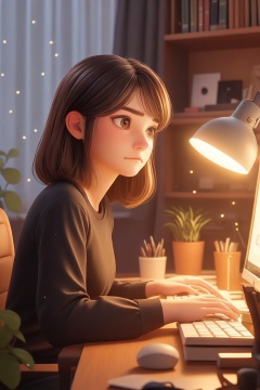 1girl,mole under eye,solo,lamp,indoors,mole,sitting,long sleeves,plant,brown eyes,brown hair,medium hair,book,chair,closed mouth,paper,bookshelf,desk,curtains,shirt,black shirt,light particles,cup,keyboard (computer),desk lamp,black hair,GZNH