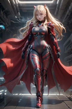 1girl,Future style gel coat,Future Combat Suit,armor,armored boots,red cape,blonde hair,bodysuit,boots,breasts,cloak,full body,long hair,looking at viewer,medium breasts,solo,standing,twintails