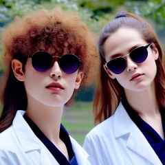 (masterpiece, best quality,) (ultra-detailed), no makeup, camera, realistic, black hair, necklace, jewelry, shirt, sunglasses, multiple girls, multiple boys, real life insert, blurry, 2girls, t-shirt, glasses, ponytail, outdoors, labcoat