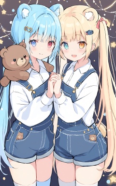 (masterpiece),(best quality) flat pencil, white shirt, 2girls, shirt, multiple girls, twintails, animal ears, stuffed animal, heterochromia, thighhighs, blue eyes, blonde hair, stuffed toy, teddy bear, smile, long hair, very long hair, animal ear fluff, blue hair, :d, hair ornament, overalls, blush, bear hair ornament, long sleeves, bangs, holding hands, fang, red eyes, closed mouth