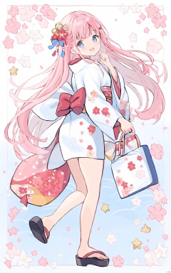 (masterpiece),(best quality) flat pencil, 1girl, solo, kimono, japanese clothes, blue eyes, long hair, wide sleeves, pink hair, long sleeves, smile, obi, sash, bangs, full body, blush, white kimono, very long hair, floral print, holding, hair ornament, looking at viewer, zouri, print kimono, star \(symbol\), shoe soles, bow, standing on one leg, standing, looking back, signature, hand up, :d