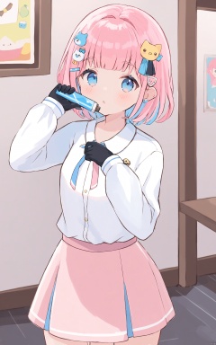 (masterpiece),(best quality) flat pencil, 1girl, solo, blue eyes, pink hair, skirt, looking at viewer, multicolored hair, hair ornament, holding, gloves, shirt, bangs, long sleeves, white shirt, virtual youtuber, blush