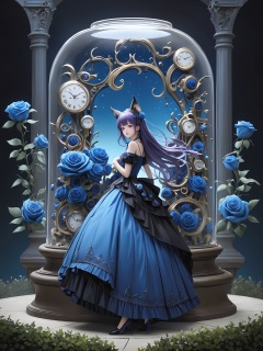 dynamic,super detail,selle shadow,8k detail post-processing,grandeur,super realism,8k,epic composition,complex detail,masterpiece,best quality,1girl,in a jar,jar,simple background,full body,flower,sitting,erune,Hourglass,Twisted time,many blue clocks,Spatial distortion,Crossing time,twisted clock,crack,blue background,master's Work,Masterpiece,8k,120 Frames,A Girl Flying,Eyes Shining,Broken Void,Blue Rose,Gothic Art,Dream,Starry Sky,Girl with Blue and Purple Hair,Blue Rose Sea,Shoulder Shoulder,Long Hair Fluttering,Sea,Aestheticism. Classical,long skirt,gorgeous skirt,bubble sleeves,carrying skirt,noble,elegant lady,blue rose,beautiful,blue rose hair accessories,walking in the blue rose garden,correct human body proportions,multi-layer skirt,rose necklace,rose earrings,holding a large bunch of blue roses,masterpiece,best quality,