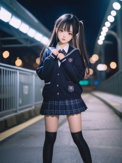Asian female,young,school uniform,pleated skirt,thigh high socks,cardigan,night scene,long hair,hair ties,standing pose,looking at camera,outdoor,illuminated,bokeh background,street style,fashion,adolescent,dark tones,streetwear,overpass,urban setting,