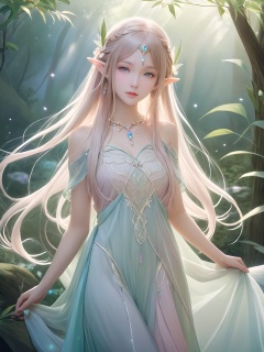 elf,enchanting beauty,fantasy,ethereal glow,pointed ears,delicate facial features,long elegant hair,nature-themed attire,mystical ambiance,soft lighting,tranquil expression,harmonious with nature,subtle magical elements,serene,intricate jewelry,dreamlike quality,pastel colors,cowboy shot,