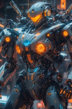 (masterpiece, best quality:1.2),robot,cable,Mecha,Full mecha,full body, cyborg, glowing, glowing eyes,Luminous mecha,Samurai mecha,Orange and blue light sources,White camera on the side head and aircraft wing structure,Black mecha,Mini mecha,Multi light source mecha, grey background, mecha, power armor, realistic, robot, robot joints, science fiction, solo, weapon