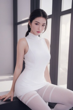 1girl,fashion model,female focus,(masterpiece, realistic, best quality, highly detailed, profession),asian,Charming eyes,exquisite facial features,white sleeveless_dress,pretty,dynamic pose,white pantyhose,pantyshot,indoors,studio lighting,neon,cinematic composition,blurry,plns,sw, plns,1girl