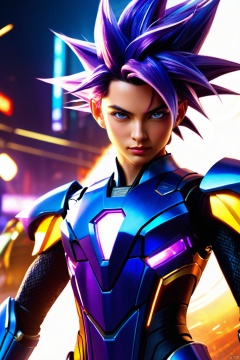 cinematic photo AND Hyperrealistic art, a woman in a blue costume with purple hair and blue eyes, alternate hairstyle, bisexual lighting, still from alita, blue and purple lighting, super saiyan sonic movie poster, official concept art, official artwork hdr, cool purple lighting, epic cold blue lighting, concept art for movie, big glowing netflix logo behind, purple lightning, movie still of robot goku, movie concept art . 35mm photograph, film, bokeh, professional, 4k, highly detailed